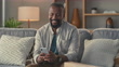 4k videobeelden van een man die op zijn bank ontspant terwijl hij zijn mobiele telefoon gebruikt om te sms'en - 4K Stockvideo
