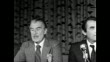 Actors Walter Pidgeon and Gregory Peck sit with Jules Stein and George Bagnall at long white table on a stage / press film announcement of movie for charity in Hollywood, California.