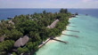 Aerial panning shot of water bungalows at luxurious resort against sky, drone flying over tourists at hotel on sunny day - Water bungalows at Maldives island