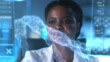 An African -American scientist in close-up behind the HUD screen with a medical model on it