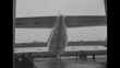 An elevated view of the Brabazon I airliner parked in front of a huge hangar, a large crowd is gathered / A pan of the aircraft from the tail / the crowd of hundreds / plane, pan to the reviewing stand with Air Chief Marshal Sir William Alec Coryton giving a speech with veteran aviator John Moore-Brabazon standing by / SOT Coryton, "And now I think it is for me really to say I name this aircraft the Brabazon", he pushes a button / the hangar doors open / VS the airplane is pushed back into the hangar / men in white overalls pushing the wheel / Pan up pilot looking out his window / pan of the plane parked inside / QS the crowd running inside / SOT Coryton, "And now as I complete the ceremony of launching the Brabazon I want to state my faith in the aircraft that is based upon the skill and determination of all those who are playing such an important part in the fulfillment of this great enterprise" / Another shot of the plane backing into hangar / hundreds of people run into the hangar / Note: exact day not known