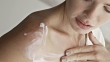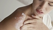 Slow motion, close up video clip of a beautiful young woman applying moisturizer (or suntan lotion) to her shoulder. She has a very good complexion and maintains it by regular moisturizing.