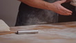 Close up on hands of Artisan bakers working with dough. Making buns and stacking them on a proofing cloth.