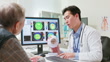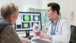 closeup side view asian elderly male patient visit ophthalmologist - the doctor use eye model and computer to explain vision care pathology as well as laser treatment details