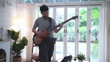 Asian man in a gray t-shirt plays an electric bass guitar in a bright living room filled with natural light. Surrounded by plants and large windows, enjoys a calm and creative musical moment at home. - 4K Stockvideo