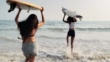 Aziatische twee mooie jonge vrouwen surfer meisjes in bikini's met witte surfplanken op een strand. Sport Cinemagraphs - 4K Stockvideo