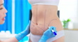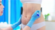 closeup asian woman having her belly fat examined by plastic surgeon using marker lines for correction location before liposuction surgery