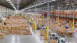 Drone shot of a busy fulfillment center in Southern California, where a large team of workers is picking items from shelves and packaging them for delivery.