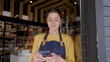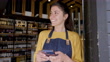 Beautiful business owner of a gourmet shop taking a break texting on smartphone while leaning against the entrance door - 4K Stockvideo