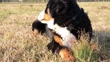 Bernese Mountain Dog lying on dry grass chewing on a stick. Outdoor setting in a sunny field. - 4K Stockvideo