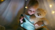 Book, flashlight and teddy bear with a girl in a tent in the bedroom of her home to camp at night. Kids, reading or storytelling with a young child kissing and hugging her stuffed toy at bedtime - 4K Stockvideo