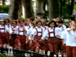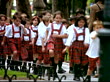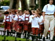 Boys and girls in red tartan private school uniform walk and skip along pathway, Madrid