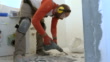 Side view footage of construction worker removing old tiles in the bathroom using air hammer