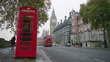 Wide shot panning across a busy street with a bus to a red telephone booth in Westminster with Big Ben in the background. Captured on Arri Alexa camera.