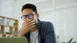Business, stress and asian man with laptop in office with burnout, mistake or eye strain. Anxiety, face and male entrepreneur frustrated by glitch, 404 or report, tax or audit, fail or disaster - 4K Stockvideo