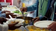 Large team of volunteers serve healthy vegetable soup and salad, potato chips and other food items to homeless people. View is of hands serving others.