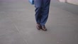 MILAN, ITALY - JANUARY 14: (SLOW-MO) Carlo Sestini wears blue sunglasses, a black with camel / white / blue paint pattern shirt from Fendi, a navy blue blazer jacket from Fendi, matching navy blue suit pants from Fendi, a black braided leather belt, a blue grained leather handbag from Fendi, dark brown shiny leather derbies from Fendi, outside Fendi, during the Milan Menswear Fall/Winter 2023/2024 on January 14, 2023 in Milan, Italy. (Footage by Edward Berthelot/Getty Images)