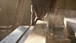 Carpenter cutting wooden plank