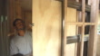 Carpenter fine tuning sliding door in house under construction