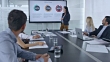 Wide handheld shot of a Caucasian woman giving a financial presentation, explaining market shares to her colleagues sitting in the conference room. Shot in Slovenia.