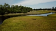 Aerial view over the marsh grasses lining the shoreline in the Croatan National Forest on a sunny afternoon.