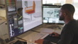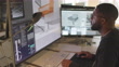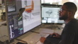 Stock photograph of a black male furniture designer working with CAD to design a contemporary chair, he’s working on a large computer screen.