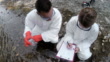 Professional laboratory workers testing water from a forest river