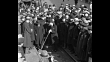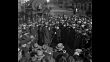 Title card: "City Sounds Knell of Death Avenue New York -Mayor Walker opens West side improvement drive to remove street railroad tracks" / Mayor Jimmy Walker stands with Patrick Crowley, President of the New York Central and Hudson River Railroad Company, at intersection of 11th Ave. & 60th St., big crowd of men in top coats & hats surround them in front of large steam engine, he speaks of significance of ceremony / MS Walker SOT to Crowley "the very fine spirit with which you approach the final elimination of what has for years been known as the Death Avenue Tracks" / Crowley replies "this marks the first step in the elimination of Death Avenue" / Walker uses long crowbar to remove rail spike, then hands bar to Crowley who begins a speech holding the crow bar / Note: audio varies in speed