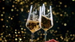 Slow motion medium locked down shot of two glasses of sparkling wine clinking while golden confetti are flying in the background. Shot in Slovenia.