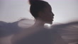 Close-up beautiful liberated mysterious african ethnicity woman holding transparent white veil waving on wind behind her - 4K Stockvideo