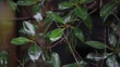 Torrential rain hits broad, glossy tropical leaves, sending droplets scattering and cascading from the edges. The video captures the intensity and freshness of a downpour