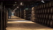 Close-up stack of wine barrels in basement at illuminated winery - Cockburns Winery