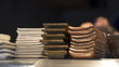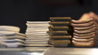 Close-up of ceramic plates stacked neatly in a Japanese restaurant kitchen. Real authentic restaurant atmosphere, Asian dining lifestyle, and food service concept.