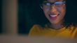 Computer, glasses reflection and woman or student for online education, university research and e learning at night. Results, studying and young african person reading college article or blog online
