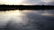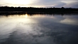 A low angle high speed track up the river at sunrise with dark forest in the background and the sky reflected