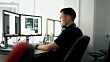 Closeup side view of mid 20's computer programmer doing some illegal activity over the internet by applying his skills. He's sitting in front of dual display computer. dolly shot. 4k