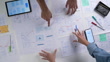 UX/UI designers discussing and brainstorming on wireframes for a website and mobile app prototype, surrounded by sketches of user flow and design tools, in the concept of website and mobile application design concept.