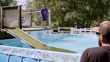 AMHERST, NEW HAMPSHIRE - AUGUST 9: (SLOW-MO) A dog jumps off a dock while participating in a North American Diving Dogs event at American K-9 Country on August 9, 2025 in Amherst, New Hampshire. In the diving event, dogs run off a dock in chase of a toy and dive into a pool. (Footage by Boston Globe via Getty Images)