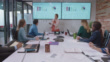 Forward tracking shot of doors opening to reveal a passionate Latin-American businesswoman explaining data graphs and statistics to her fellow multi-ethnic business partners during a team meeting in a modern office board room
