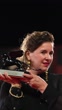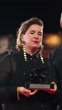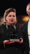 VENICE, ITALY - SEPTEMBER 7: Dorothe Beinemeier (R) poses with the Horizons Best Screenplay award for "Happy Holidays" during the 81st Venice International Film Festival at Palazzo del Cinema on September 7, 2024 in Venice, Italy. (Footage by Mark Case/Getty Images)