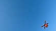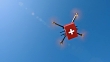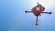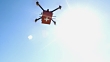 Wide handheld shot of a drone carrying a first aid kit across sunny sky.