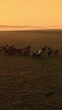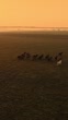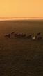 Aerial drone footage captures herd of horses running across wide open field at sunrise. Warm golden light of morning sun creates dramatic scene as animals move together in natural rhythm. Mist on horizon adds peaceful mood while fast motion of horses highlights beauty and freedom of countryside landscape.