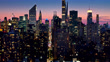 Aerial establishing shot of New York City on a summer evening, taken from over the East River and looking towards Midtown Manhattan.