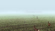 Drone shot showing roe deer running across wide misty field in cold morning fog. Soft grey tones cover open landscape while cautious animals move together through low haze. Calm natural scene with gentle light and quiet motion creating peaceful wildlife moment.