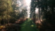 Drone view flying down a sunny forest trail - 4K Stockvideo