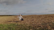 Wide shot of a Caucasian toddler boy energetically playing with a toy tractor in a harvested field, then running joyfully across the field while holding the toy under a bright sky.