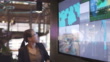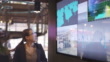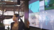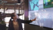 4K stock video clip of a young Asian woman conducting a seminar / lecture with the aid of a large screen. The screen is displaying moving data & designs concerning low carbon electricity production with solar panels & wind turbines. These are juxtaposed with footage of conventional fossil fuel oil production.