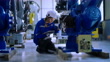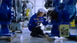 Engineer examining welding robot in plant warehouse. - 4K Stockvideo