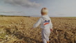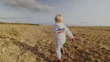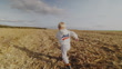 Wide tracking shot of a young Caucasian toddler boy walking and then running through a harvested cornfield. The expansive landscape and open sky create a backdrop for his joyful exploration of the autumn setting.