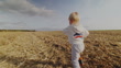 Enthusiastic Toddler Joyfully Running Through a Harvested Cornfield Under a Vast Open Sky - 4K Stockvideo
